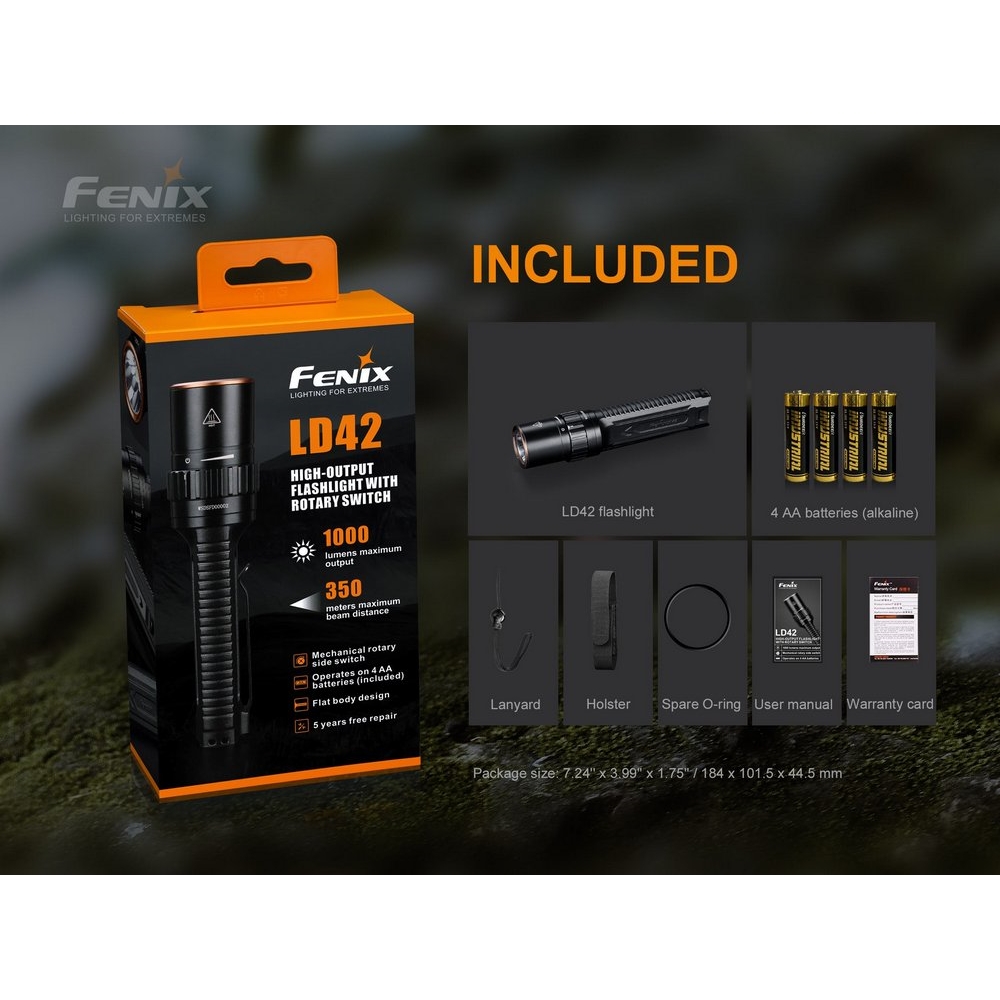 A LD42 é uma lanterna de alto rendimento com interruptor rotativo mecânico 1000 lúmens de potência máxima. Possui um feixe de longo alcance excepcional que é capaz de localizar o alvo de distância – uma grande ajuda na iluminação noturna e busca.